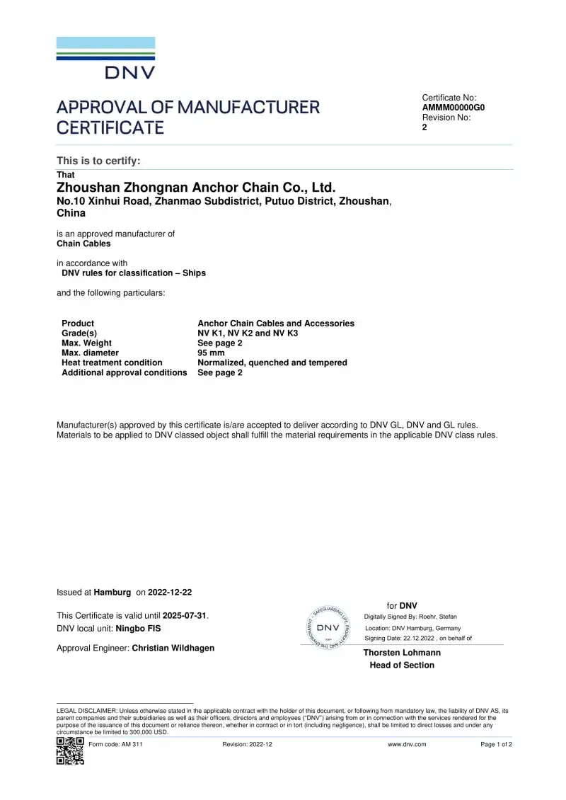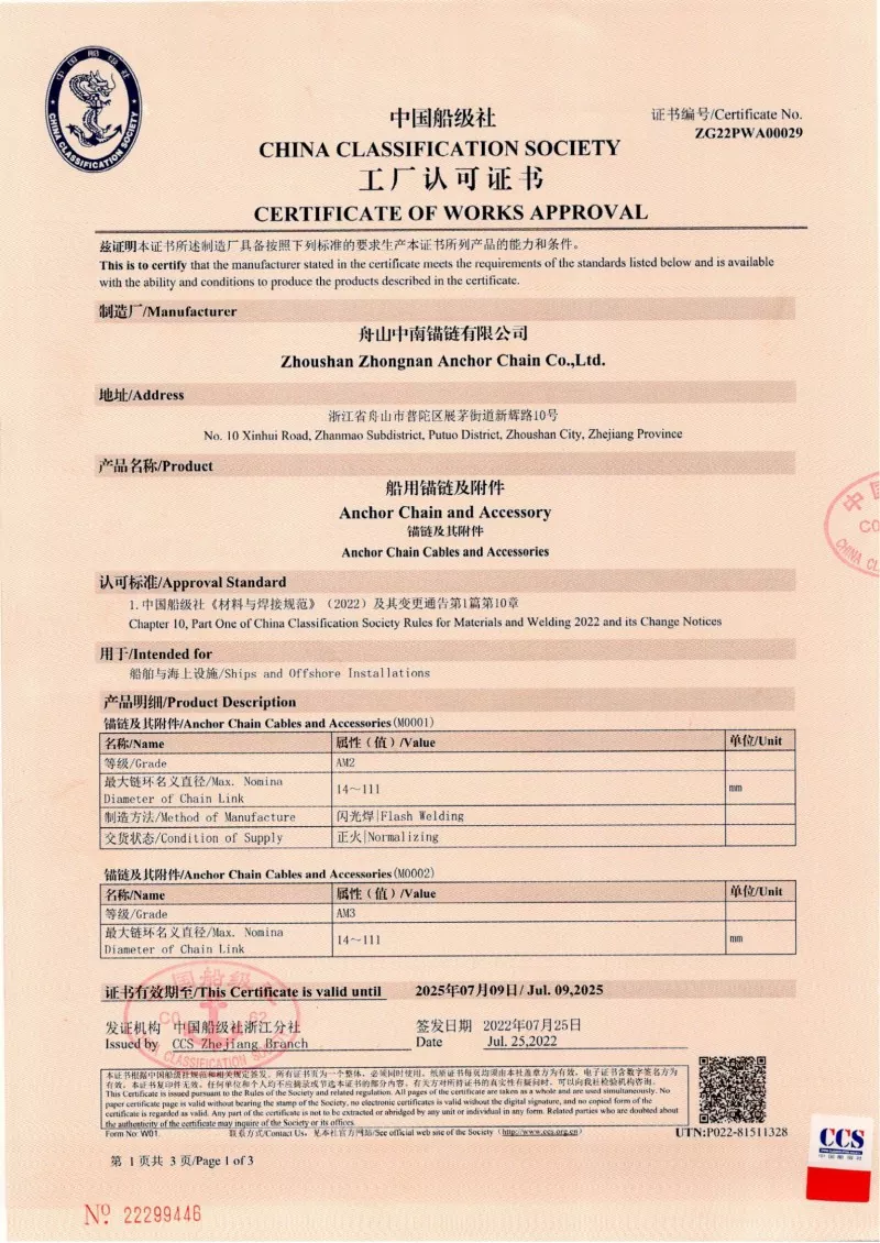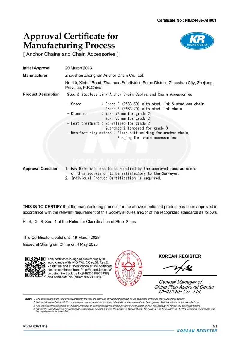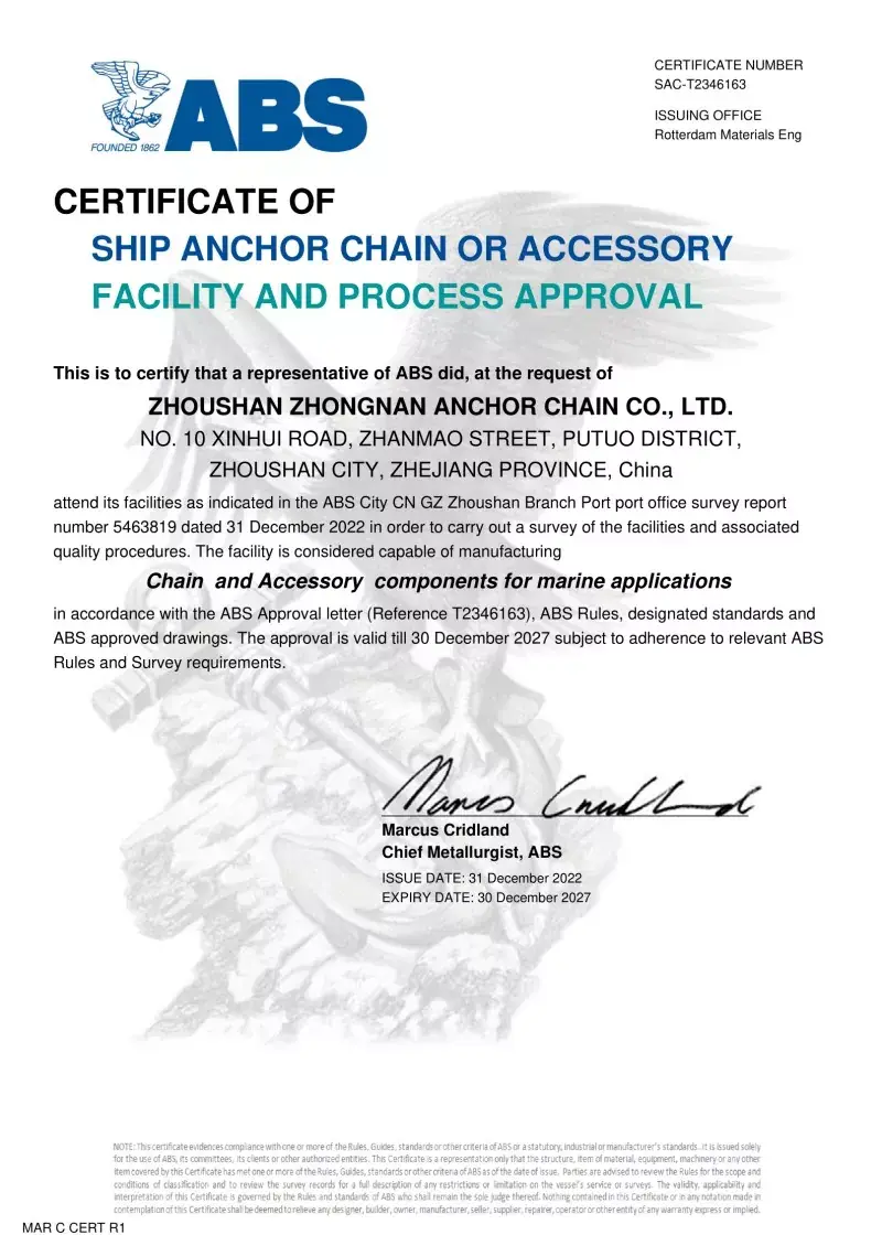 Da. Toate accesoriile noastre de lanțuri de ancorare sunt fabricate în conformitate cu aceleași standarde internaționale care se aplică lanțurilor de ancorare în sine (ISO, IACS), inclusiv aprobări de la CCS, ABS, DNV, LR, BV, NK, KR, Rina și RS. Aceste certificări asigură că accesoriile îndeplinesc cerințele pentru precizia dimensională, siguranța și rezistența mecanică stabilite de către constructorii de nave globale și operatorii offshore.