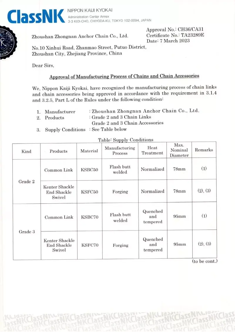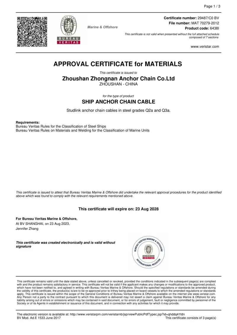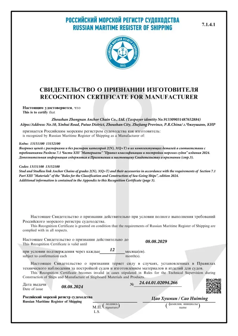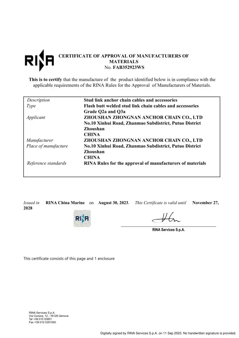 Da. Toate accesoriile noastre de lanțuri de ancorare sunt fabricate în conformitate cu aceleași standarde internaționale care se aplică lanțurilor de ancorare în sine (ISO, IACS), inclusiv aprobări de la CCS, ABS, DNV, LR, BV, NK, KR, Rina și RS. Aceste certificări asigură că accesoriile îndeplinesc cerințele pentru precizia dimensională, siguranța și rezistența mecanică stabilite de către constructorii de nave globale și operatorii offshore.